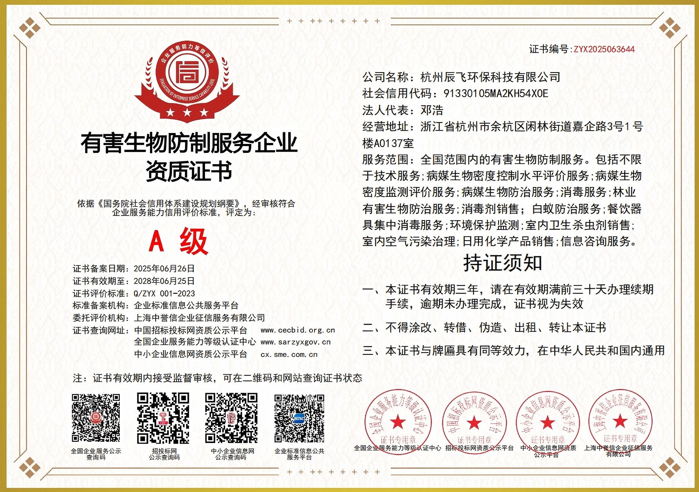 杭州辰飛環(huán)保科技有限公司是一家專業(yè)的PCO有害生物防治服務機構。是經(jīng)杭州市工商局注冊登記、杭州市白蟻防治管理所、PCO協(xié)會批準的城市害蟲綜合治理消殺公司,是集除四害、白蟻消殺、除蟲、消毒殺菌、室內(nèi)空氣污染治理、藥械銷售于一體的大型專業(yè)杭州有害生物防治科技有限公司。主要從事新建、擴建、改建、裝飾裝修單位建筑物的白蟻防治和白蟻預防工程,同時從事工廠、酒店、企事業(yè)單位、住宅小區(qū)和家庭的”四害”消殺和白蟻防治服務,長期向各類型客戶提供杭州白蟻消殺、除蟑螂、除老鼠、除蟲、消毒殺菌等優(yōu)質服務。 本公司自成立以來,秉承“誠信、敬業(yè)、高效、務實”的發(fā)展原則,以現(xiàn)...
